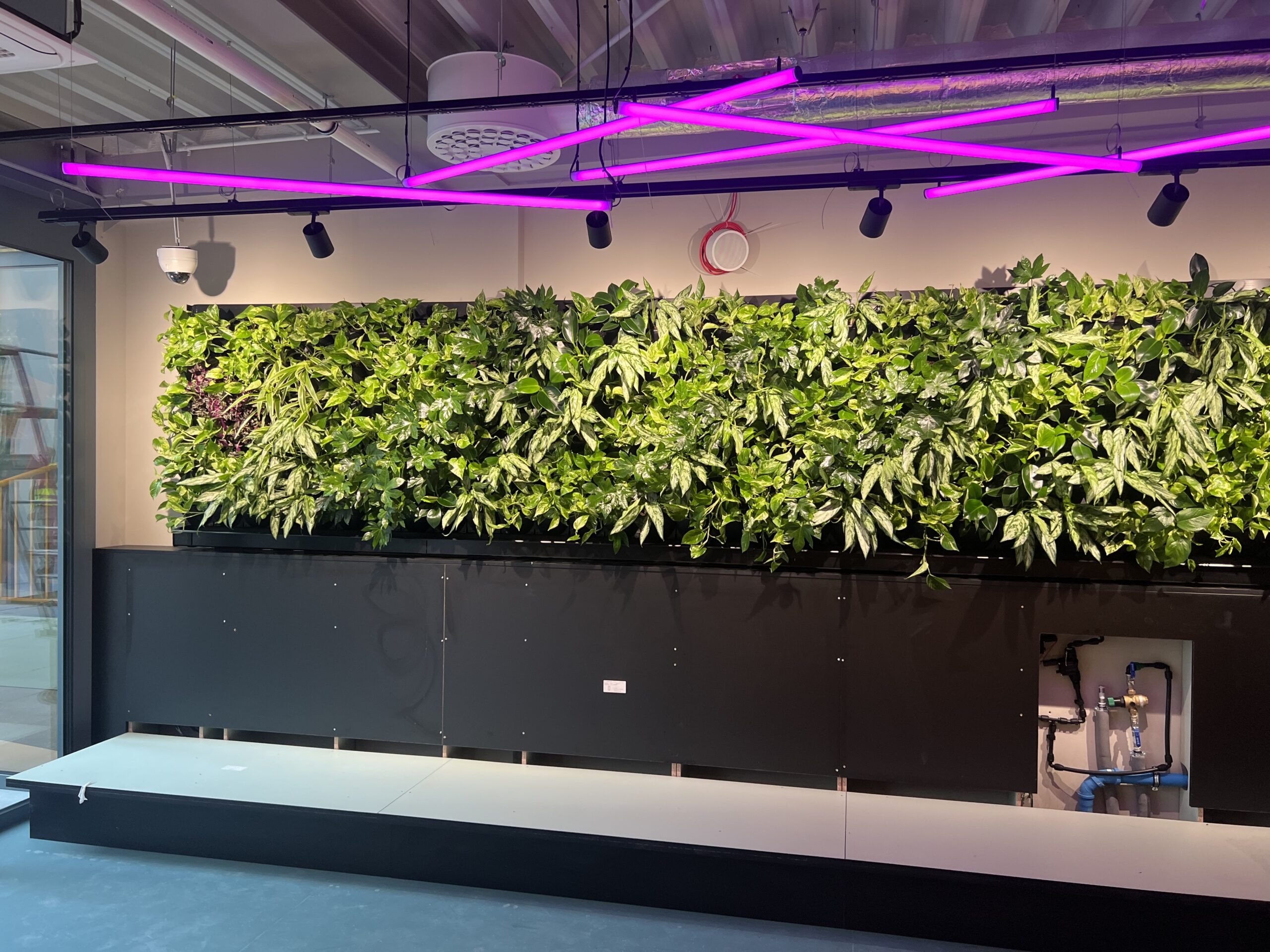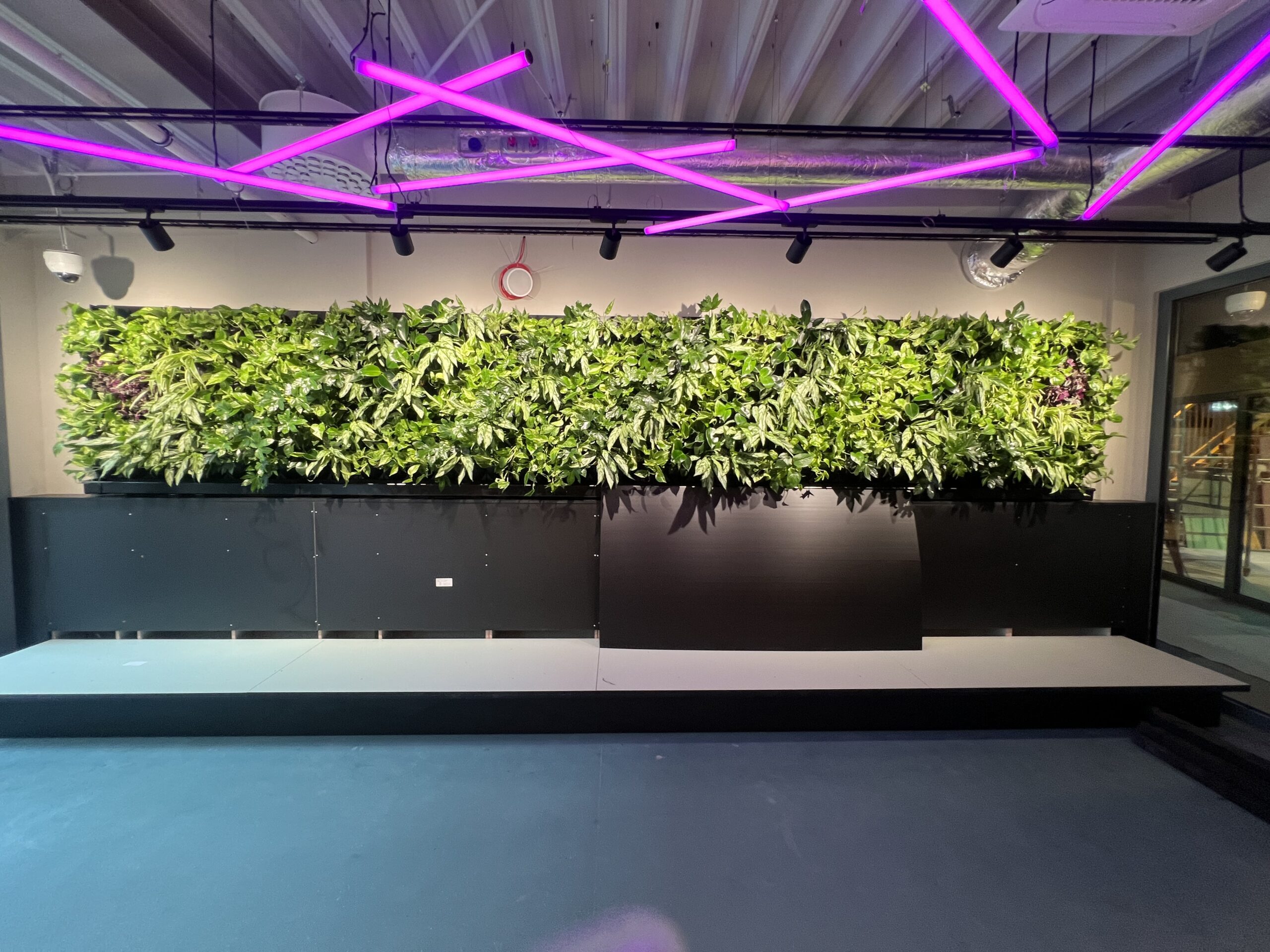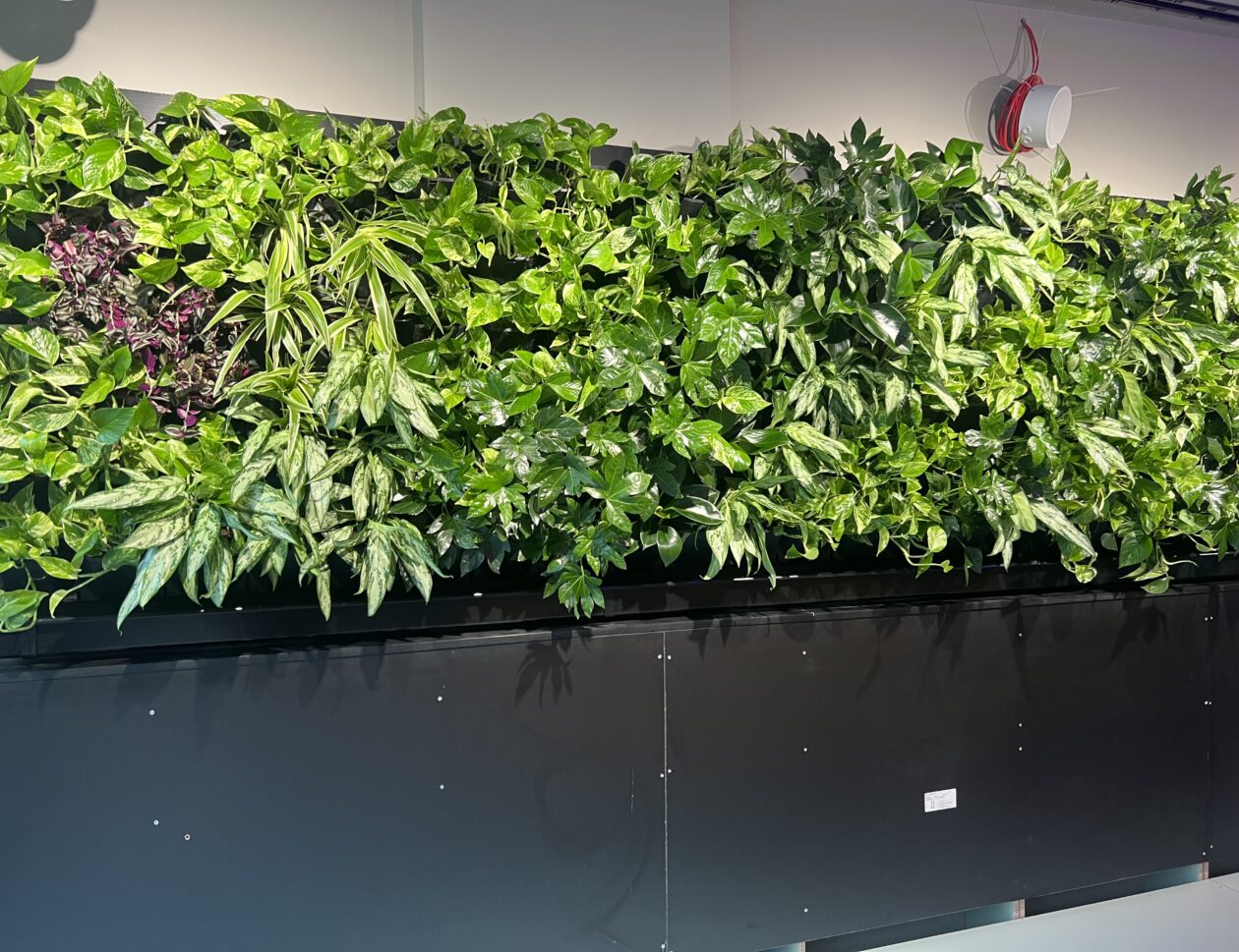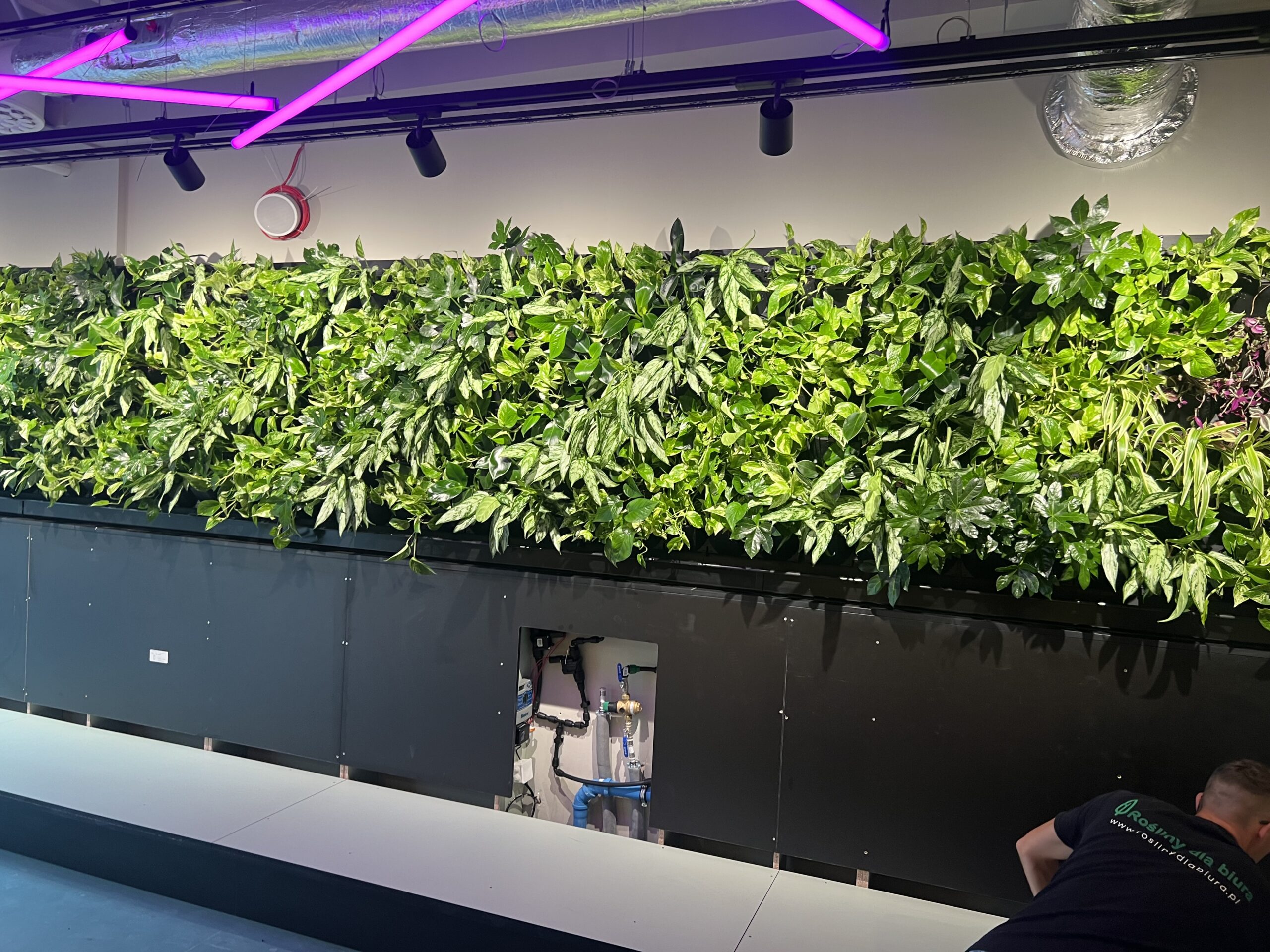 Została przygotowana specjalnie dobrana kompozycja roślin, dopasowana do warunków panujących w pomieszczeniu oraz charakteru wnętrza, tak aby ogród wertykalny był nie tylko efektowny, ale też trwały i łatwy w utrzymaniu.