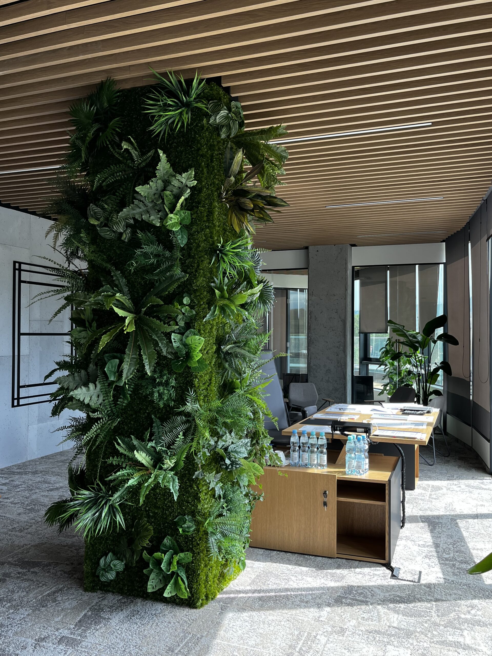 W miejscach o gorszych warunkach świetlnych lub w pomieszczeniach wymagających niskiej obsługi (np. open space, korytarze, kuchnie biurowe), lepiej sprawdzą się sztuczne ściany z roślin lub panele z mchu stabilizowanego.